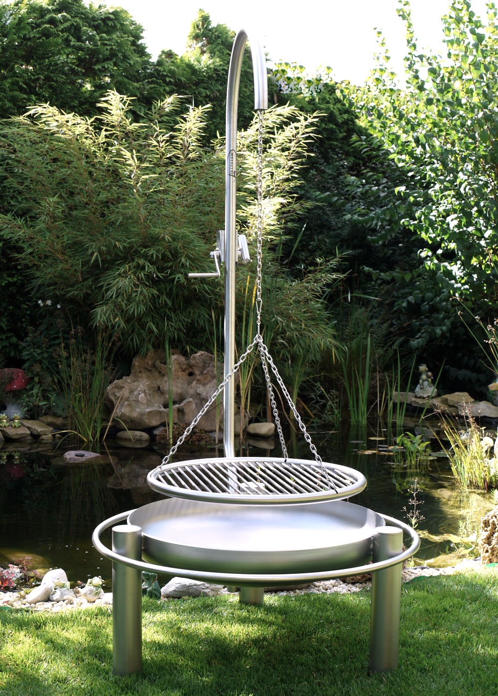 Der schwarze und hohe Schwenkgrill Ø 100cm aus Stahl schafft durch den Edelstahl-Grillrost viel Platz zum Grillieren. Der Rost ist dabei höhenverstellbar und schwenkbar – so grillieren Sie wie ein Profi! Inkl. umlaufender Reling für mehr Sicherheit und Funktionalität.
