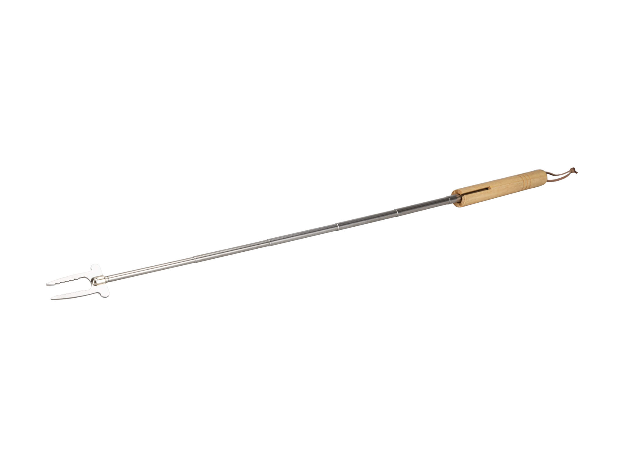 Teleskop Wurstgabel von 19cm bis auf 71cm ausziehbar. Mit Kerbe auch als «gewöhnliche» Essgabel verwendbar. Holzgriff mit Lederbändel.