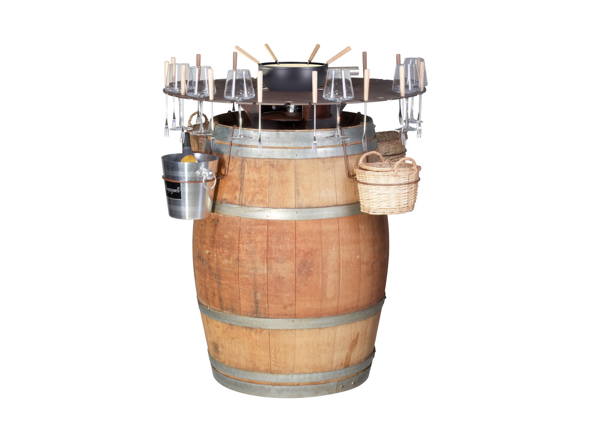 Wein- und Fonduebar für den Outdoor gebrauch, für bis zu 18 Personen. Mit Original Weinfass «Antik Barrique» aus Holz. Gewicht: 108 kg