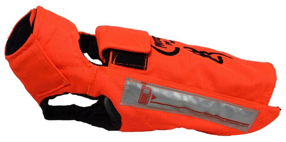 Professionelle High-End-Kevlar-Hundeschutzweste von Cano Concept Frankreich aus 4 Lagen Dynafelt – ummantelt durch widerstandsfähiges 1100 DTEX-Cordura. Der Innenbereich der Sauenschutzweste ist äußerst weich und bietet maximalen Tragekomfort sowie optimale Bewegungsfreiheit für den Jagdhund und die 4 Lagen Dynafelt bieten sehr guten Schutz vor Schwarzwild-Schägen und Bissen sowie vor Dornen und Ästen. Der Verschluss erfolgt über ein breites Klettband sowie über ein, der Hunde-Größe optimal anpassbares, Mehrfach-Reissverschluss-System. Farbe: Orange. Widerstandskraft: 4257