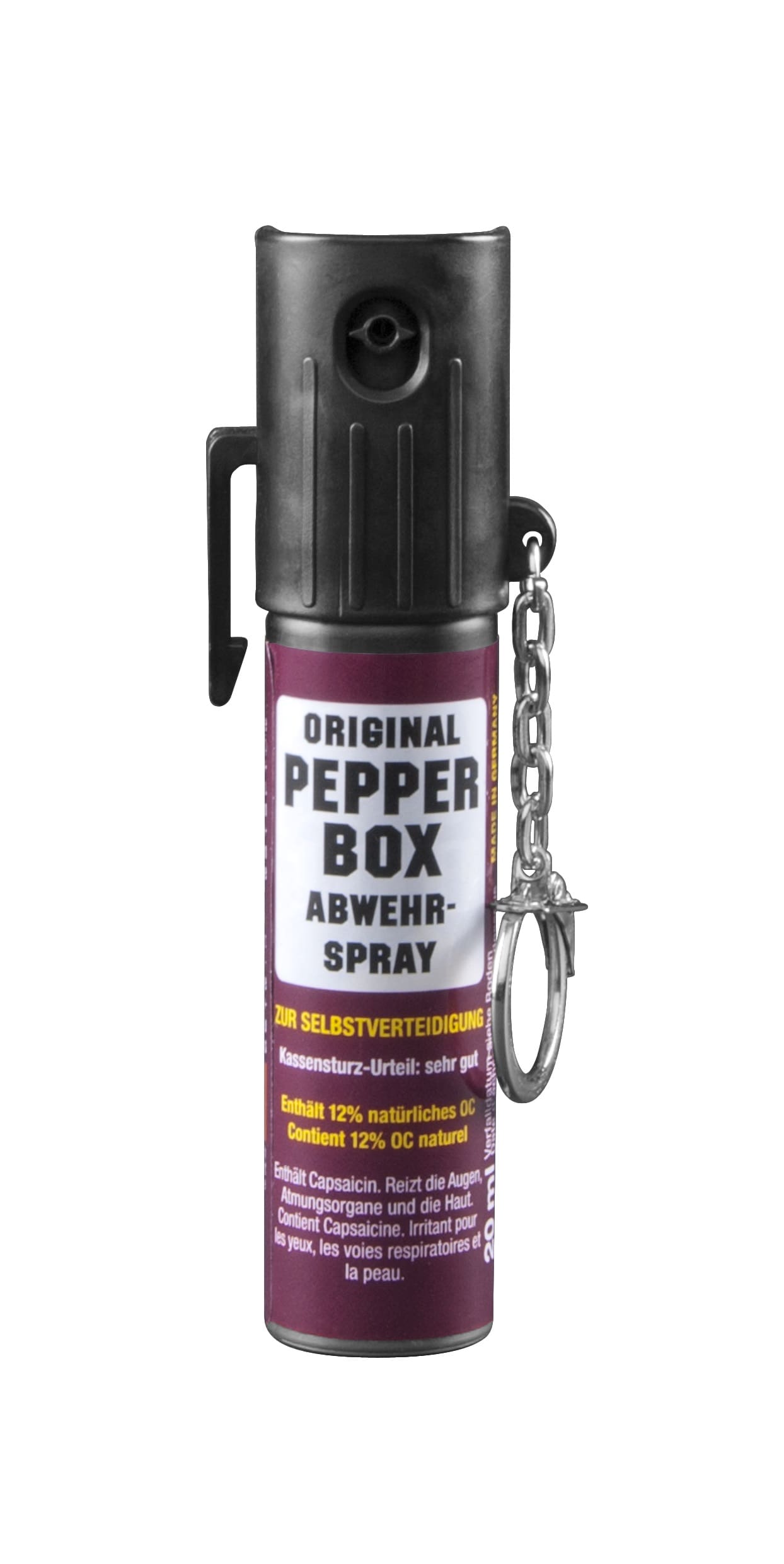 Das Pfefferspray ist mit einer hochwertigen Flip-Top Kappe ausgestattet, welche das unbeabsichtigte Auslösen des Sprays verhindert.